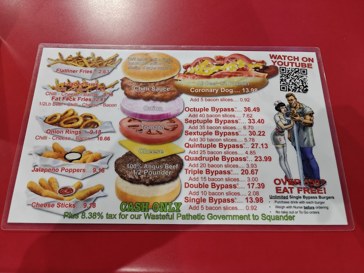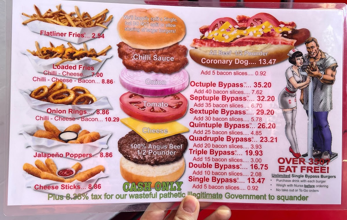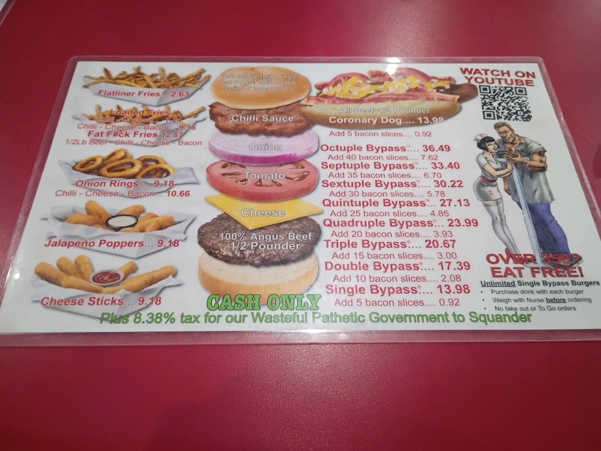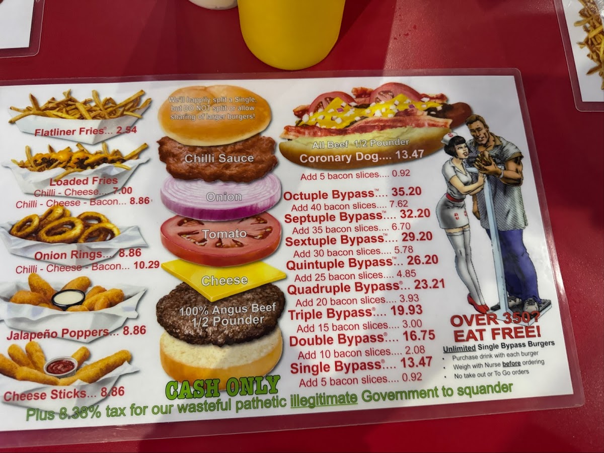 The menu features a variety of hearty hamburger options, including single and double bypass burgers that serve as the main attraction. Accompanying the burgers are several side dishes such as fries topped with chili and cheese, jalapeno poppers, and mozzarella sticks. There is also a selection of hot dogs available.
