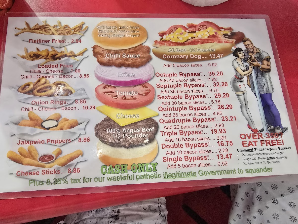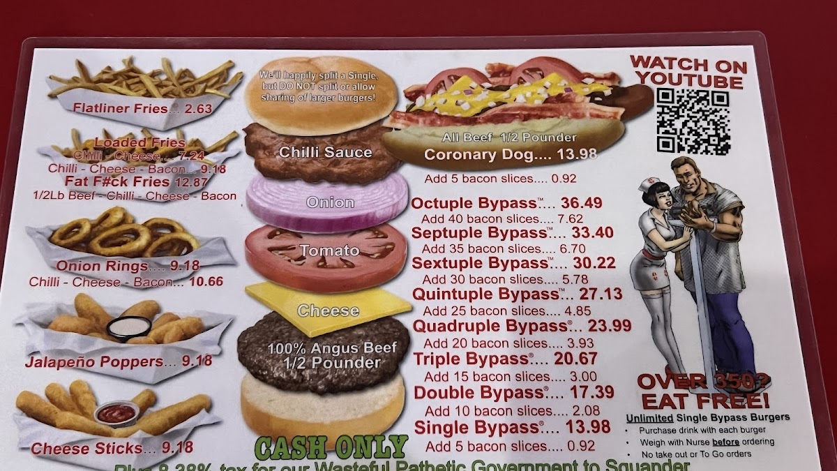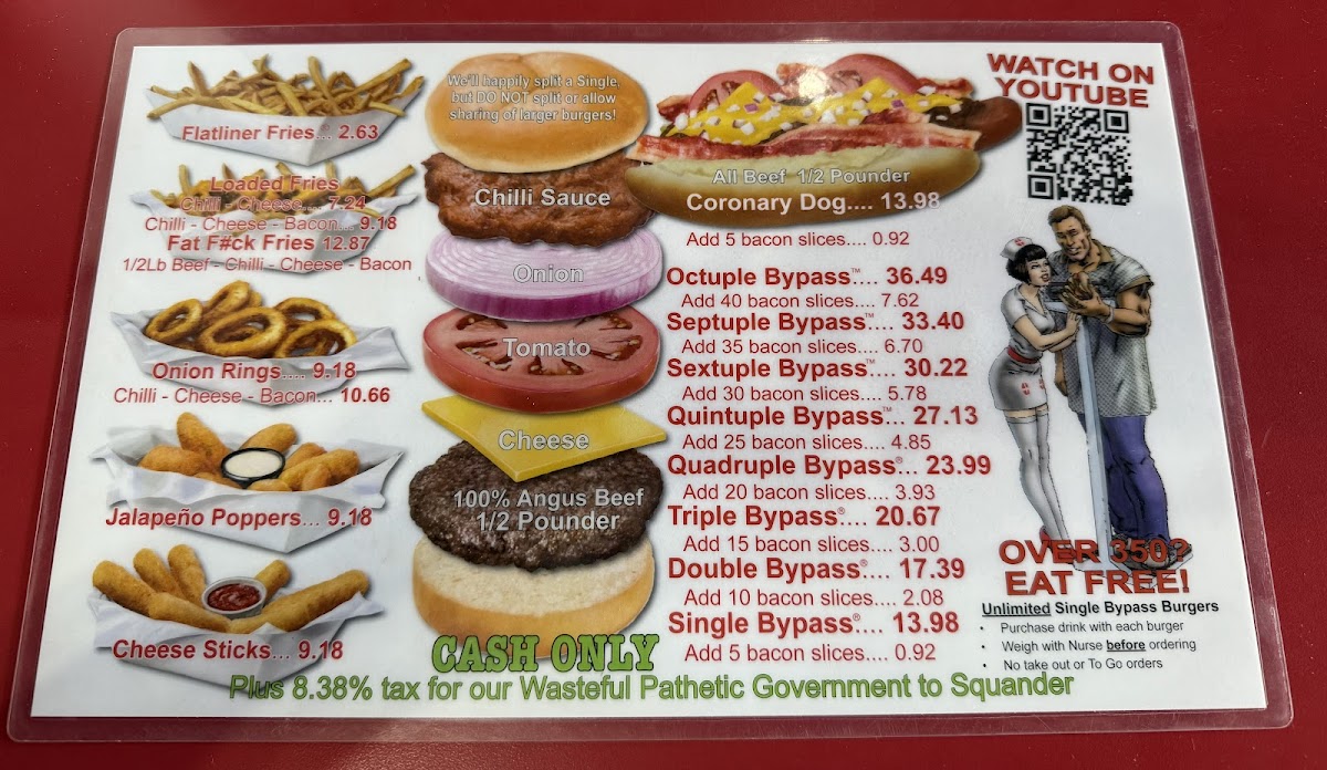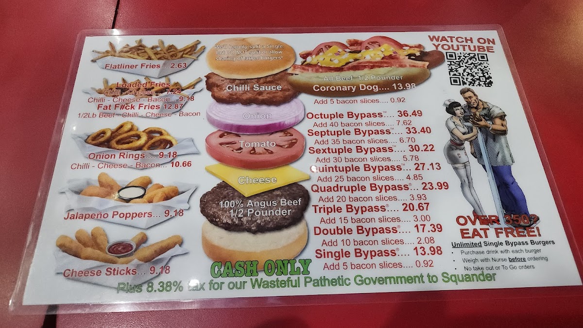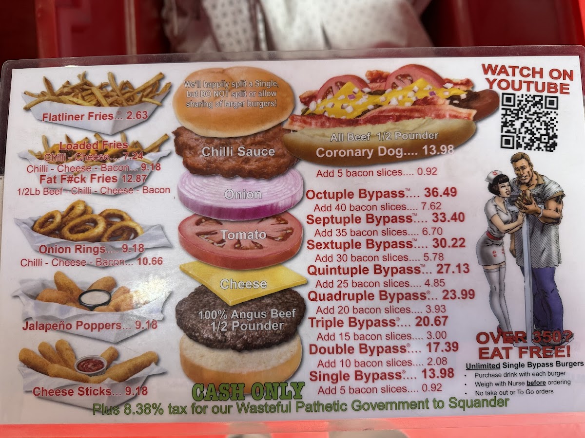 The menu features a variety of hearty hamburger options, including single and double bypass burgers that serve as the main attraction. Accompanying the burgers are several side dishes such as fries topped with chili and cheese, jalapeno poppers, and mozzarella sticks. There is also a selection of hot dogs available.